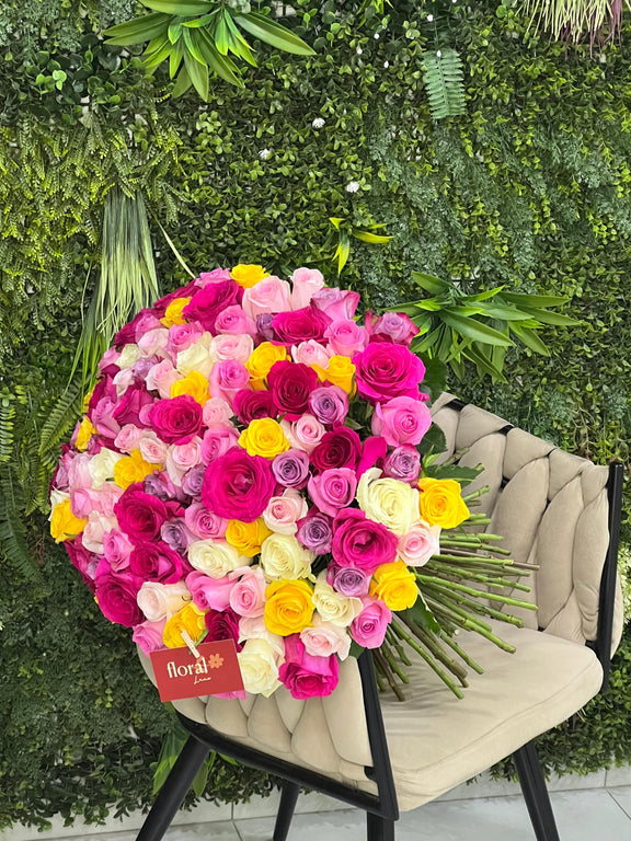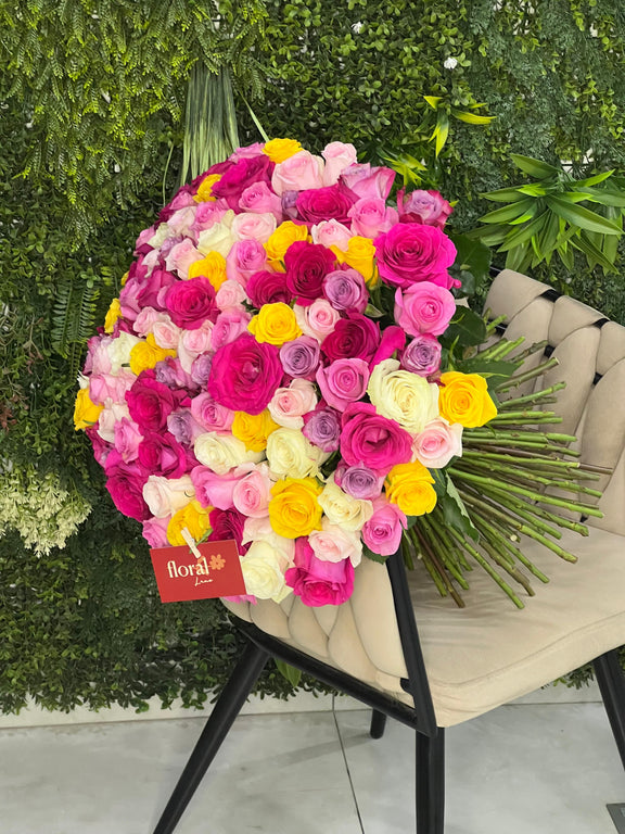 An extravagant bouquet of 101 fresh roses in a stunning medley of colors – from passionate reds to soft pinks, sunny yellows, elegant whites, and charming peaches. Each bloom is handpicked and artistically arranged to create a vibrant harmony of love, joy, and celebration. Perfect for anniversaries, birthdays, grand gestures, or simply to make someone feel truly special.