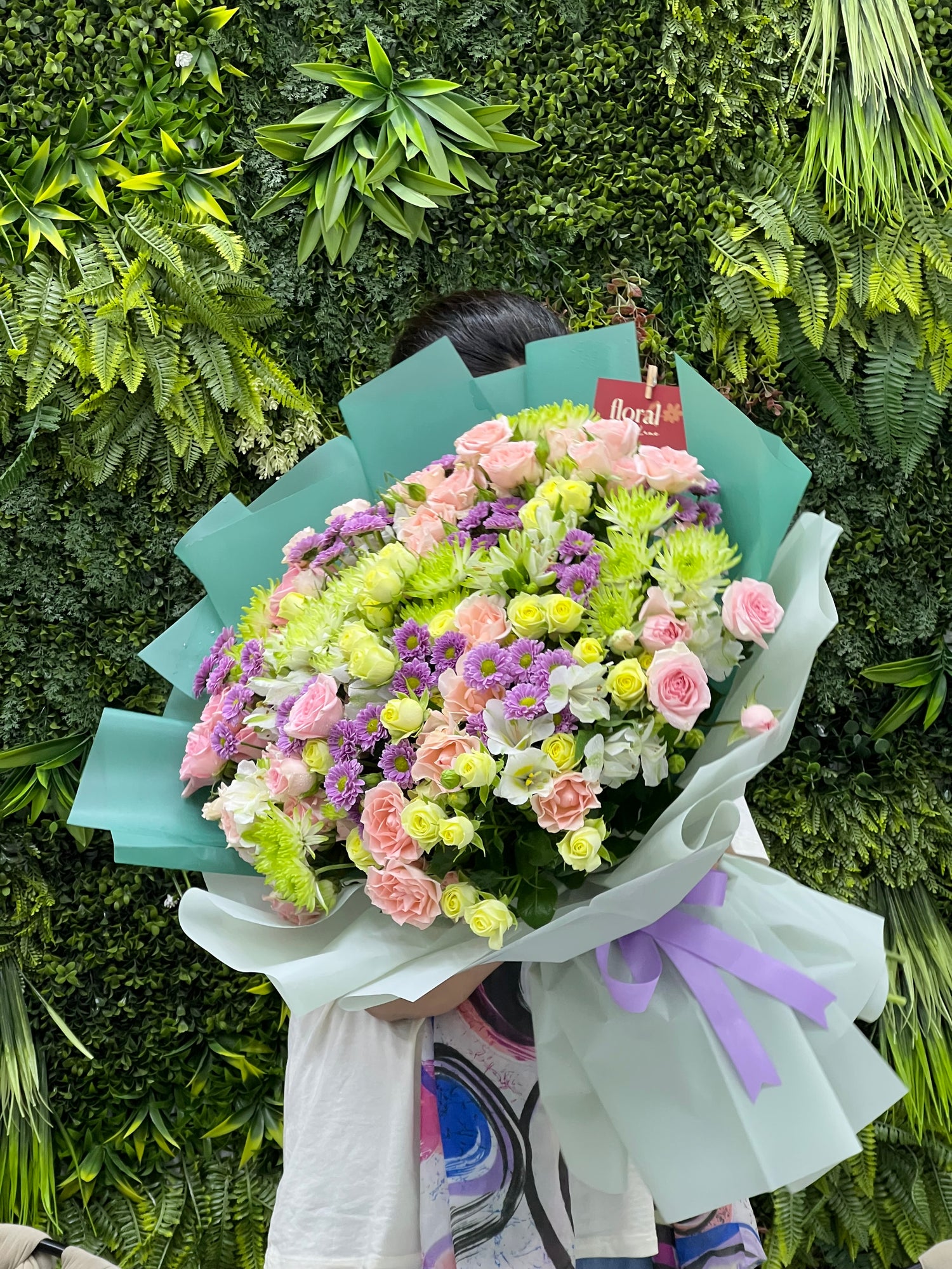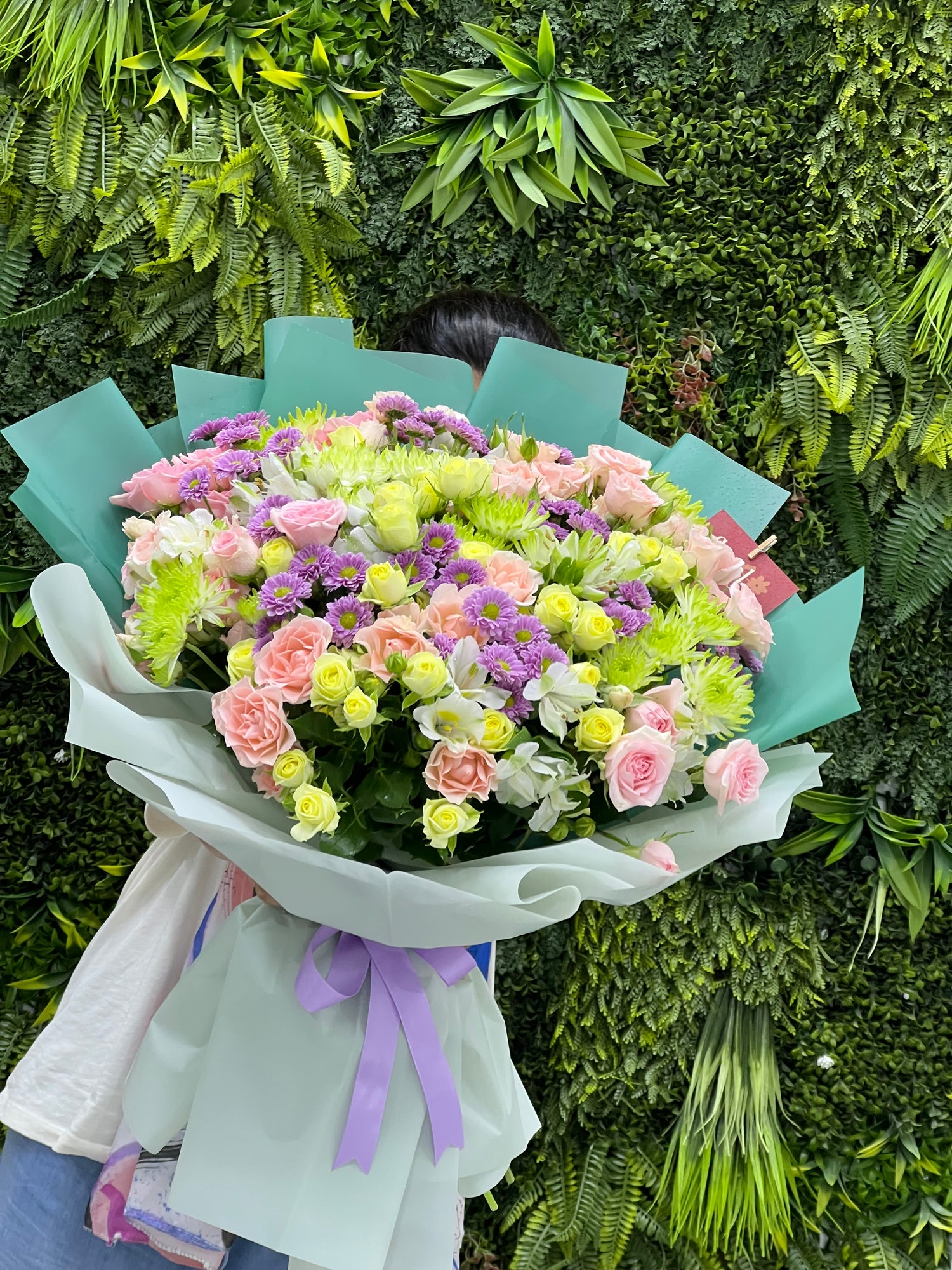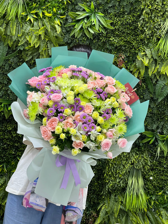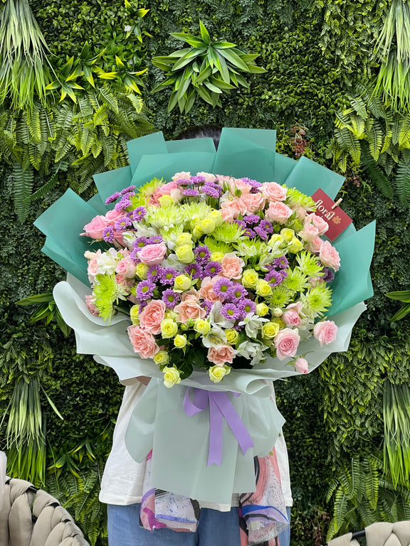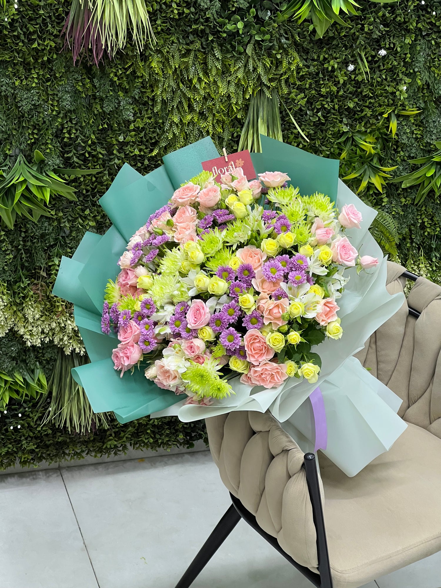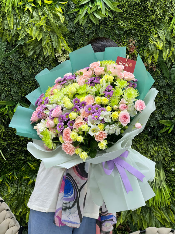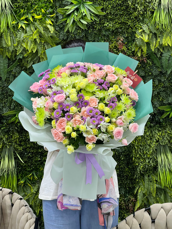A vibrant and stylish arrangement featuring 7 Alstroemerias, 19 Mixed Spray Roses, 12 Purple Chrysanthemum Santini, and 6 Green & White Chrysanthemums. This bouquet blends playful colors with graceful textures, creating a fresh and elegant gift for any special occasion.