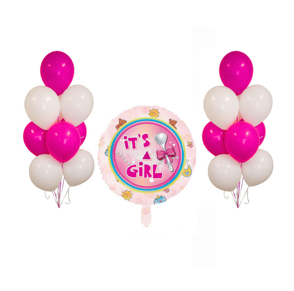 Celebrate the joyful arrival of a little princess with this charming balloon bunch. The set includes 1 “It’s a Girl” foil balloon paired with 12–14 pink and white helium-filled latex balloons, creating a cheerful and festive display for any baby celebration.