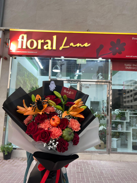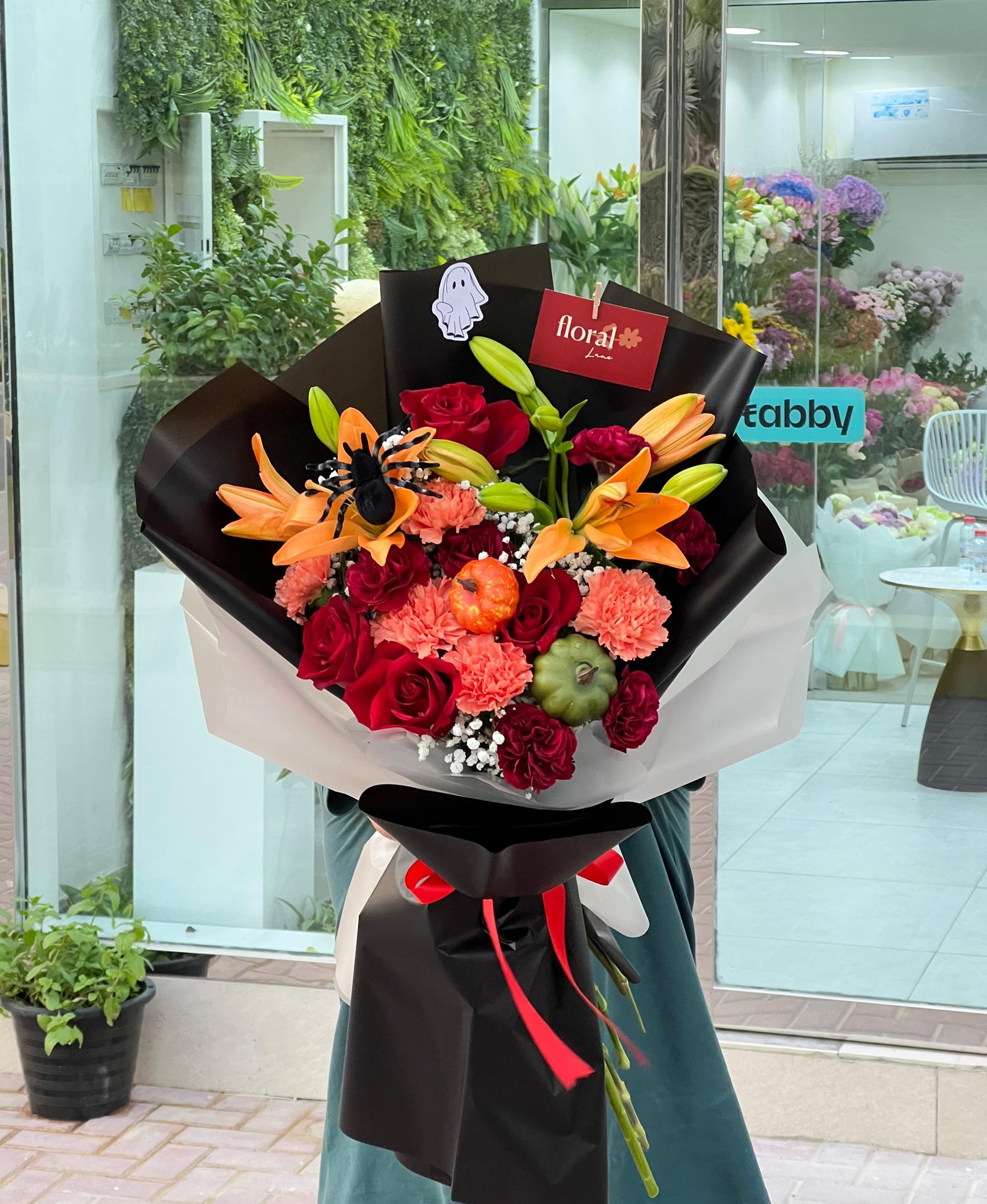 Light up your Halloween with this stunning Halloween Pumpkin Bouquet, a perfect blend of spooky charm and autumn warmth. Featuring vibrant orange lilies, red roses, and orange and maroon carnations, this bouquet bursts with rich seasonal color.